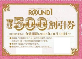 ラウンドワン 株主優待券(額面:500円)5枚セット≪有効期限:2026年10月15日まで≫【@400】販売価格(税込): ¥ 2,000 |