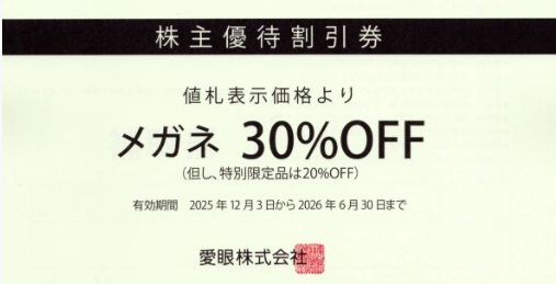 愛眼株主優待割引券(メガネ30%OFF他)1冊≪有効期限:2026年6月30日まで≫販売価格(税込): ¥ 800 |