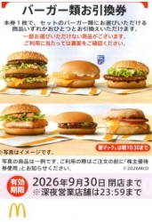 マクドナルド ハンバーガー引換券 10枚セット ≪有効期限:2026年9月30日まで≫【@440】サムライマックOK!販売価格(税込): ¥ 4,400 |